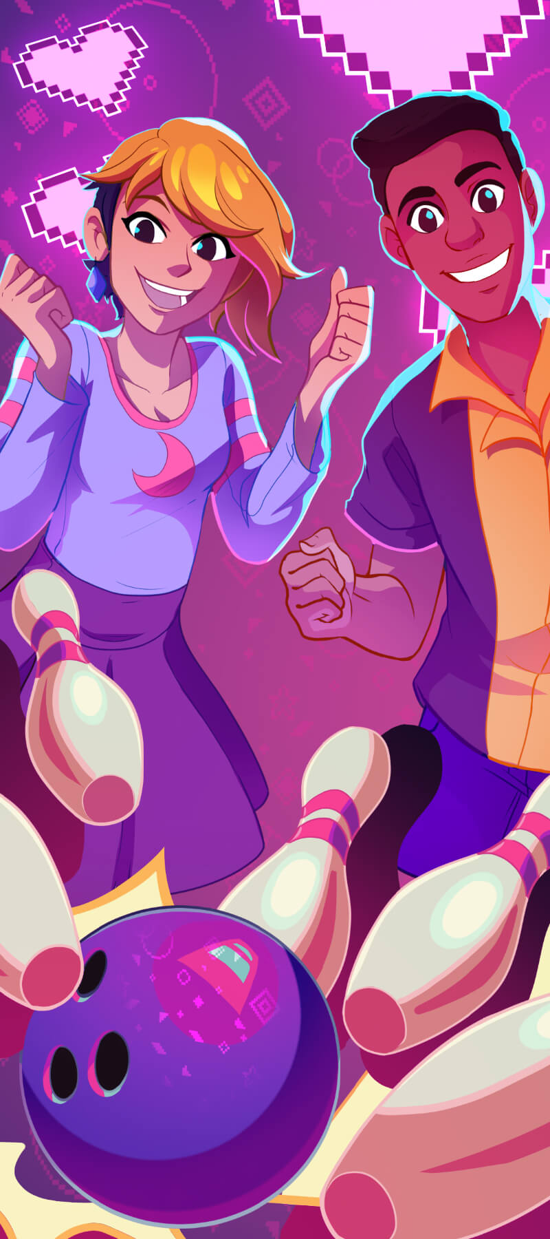 Ten characters in search of love gather around two neon-lit bowling alleys for some date night bowling. Choose your character, find your date, and try your best to hit it off—or at least hit some pins.